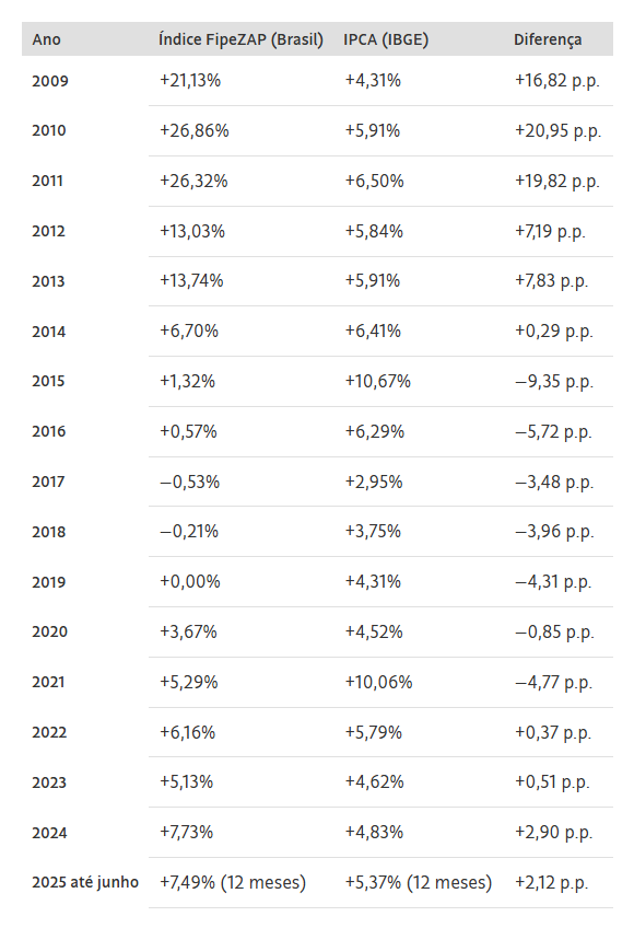 Pelo quarto ano consecutivo, os preços dos imóveis residenciais estão subindo mais do que o IPCA. Segundo o Índice FipeZAP, a valorização acumulada em 12 meses até junho foi de 7,49%, contra uma inflação de 5,37% no mesmo período. E tudo isso em um cenário em que o financiamento está entre os mais caros das últimas duas décadas.